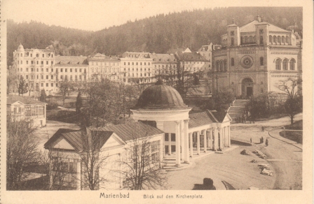 Marienbad / kraj: Karlovarský / okres: Cheb / obec s rozšířenou působností: Mariánské Lázně / pověřená obec: Mariánské Lázně / Blick gegen Cafe Egerländer, Hotel Casino, russische Kirche, Volks- und Bürgerschule