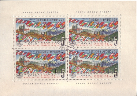 Kleinbogen = 4 Briefmarken / Druckplatte "A" / Format 140 x 100 mm / na desce "A" na ZP 1 nacházíme tečku v pravém dolním rohu na okraji známk u praporku hodnotové číslice "5" / Nachträglich entwertet Gelegenheits- Rundstempel Datum: "29. V. 67" / ohne Gummi