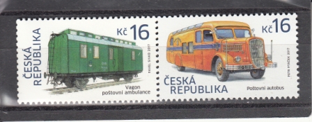 Historické dopravní prostředky: poštovní autobus + vagón poštovní ambulance