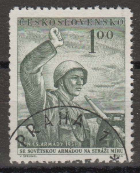 Mi.-Nr.: 692 / Tag der Armee / Artillerist am Geschütz Achtg! Einzelmarke aus Satz / Tages- Rundstempel