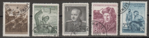 Mi.-Nr.: 691 - 695 / Tag der Armee / Infanterie in Paradeformation ● Artillerist am Geschütz ● Klement Gottwald (1896 - 1953); 3 Staatspräsident ● Panzersoldat ● Fliegertruppen Tages- Rundstempel