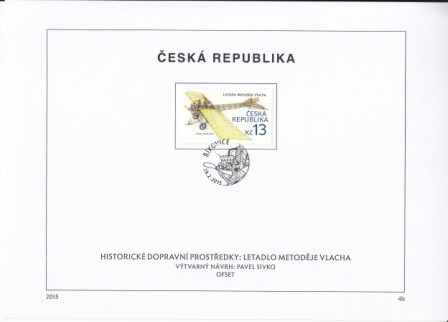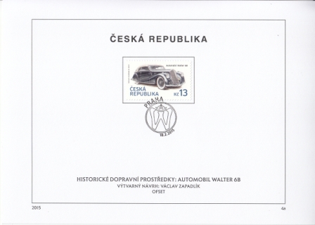 HISTORISCHE VERKEHRSMITTEL: KRAFTFAHRZEUG Walter 6B und FLUGZEUG VON Metoděj Vlach Mi.-Nr.: 836 / KRAFTFAHRZEUG / Ersttagsstempel: "Praha / 18. 2. 2015" Mi.-Nr.: 837 / FLUGZEUG / Ersttagsstempel: "Říkovice / 18. 2. 2015" Maße ca: 210 x 150 mm