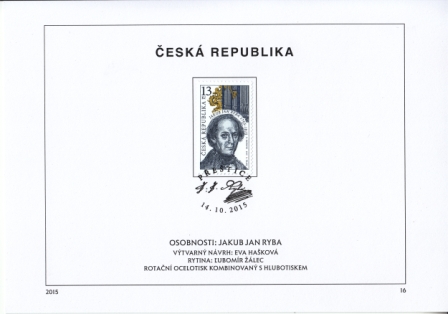 Mi.-Nr.: 861 / PERSÖNLICHKEITEN: JAKUB JAN RYBA Ersttagsstempel: "Prestice / 14.10. 2015" Maße ca: 210 x 150 mm