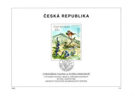 Mi.-Nr.: 441 / 22,- Kč - Enzian, Alpen - Mosaikjungfer und Blaukehlchen / Ersttaghandstempel: "22. 6. 2005 / Pec pod Snezkou"