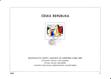 Mi.-Nr.: 8 / Ersttagsstempel: "Cheb / 12. 5. 1993" Motiv: Sport / Spiel / Gewichtheben / Europameisterschaft / Olympiade / Weltmeisterschaft Maße ca: 210 x 150 mm