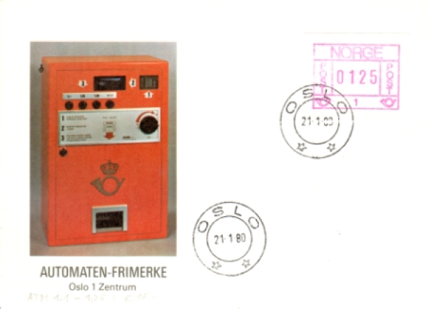 Umschlag / frankiert mit ATM 1 Norwegen - Wertstufe 0125 Tagesstempel: „Oslo / 21. 1. 80“ / Zudruck: Automaten Freimarke - Oslo 1 Zentrum sh. Abbildung nicht gelaufen / übliche Qualität Maße ca: 162 x 155 mm