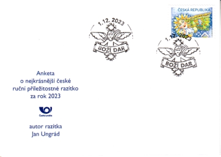 Zudruck Text: "Ankette um das schönste Handsonderstempel für das Jahr 2023 - Siegerautor des Stempels Jan Ungrád"