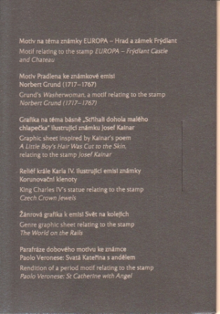 Die Abdrucke von den Gravuren werden mit der Stahldruckmaschine WAITE hergestellt, oben mit der Bezeichnung der Ausgabe, mit den Autorennamen und mit dem Logo der Tschechischen Post ergänzt. Das Konvolut von diesen fünf Gedenkdrucken wird in eine blaue Einlage-Kartonmappe der Česká pošta, s. p. eingelegt.