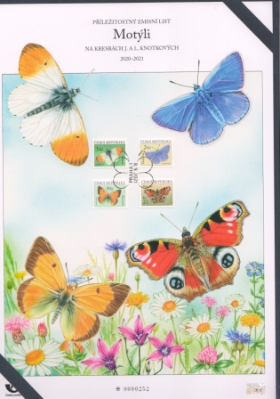 Die Česká pošta, s. p. bereitet zu den Ausgaben aus der Reihe Schmetterlinge, von Jaromír und Libuše Knotek eine Sonderausgabe – Schmetterlinge, mit allen Ausgaben aus dieser Reihe aus den Jahren 2020 - 2021, vor. Diese nummerierte Sonderausgabe mit dem Hologramm und mit dem Logo der Tschechischen Post wird alle 4 Ausgaben der Schmetterlinge, und einen Sonderstempel mit dem Datum 8.9.2021, Praha 1 enthalten. Dieser Sonderdruck (dieses Ausgabeblatt?) im Format A4 wird in eine blaue Einlage-Kartonmappe der Česká pošta, s. p. eingelegt. Diese Ausgabe ist für den 8.9.2021 geplant - der Termin kann sich jedoch noch ändern. Der Preis dieses speziellen Sonderdrucks wird 208,- CZK betragen.