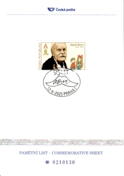 Gedenkblatt / Geburtstsag - Adolf Born – 95. narozeniny (Nummer der Tschechischen Post PLZ 109 / Briefmarke Tschechische Republik POFIS-Nr.: 1016 sh. Abbildung Ersttagsstempel / SOST: "95 Jahre / 12. 6. 2025 / Praha 1" Nummeriert: 210101–211100 / Hologramm Auflage: 1.000 Stück Maße: 105 x 148 mm