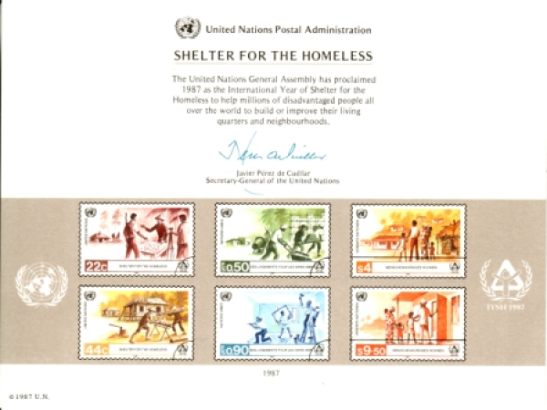 Philatelistisches Souvenir / Gedenkkarte Unterkunft für Obdachlose / Abbildung der Briefmarken UNO Genf Mi.-Nr.: 154 + 155 ■ UNO New York Mi.-Nr.: 520 + 521 ■ UNO WIEN Mi.-Nr.: 69 + 70