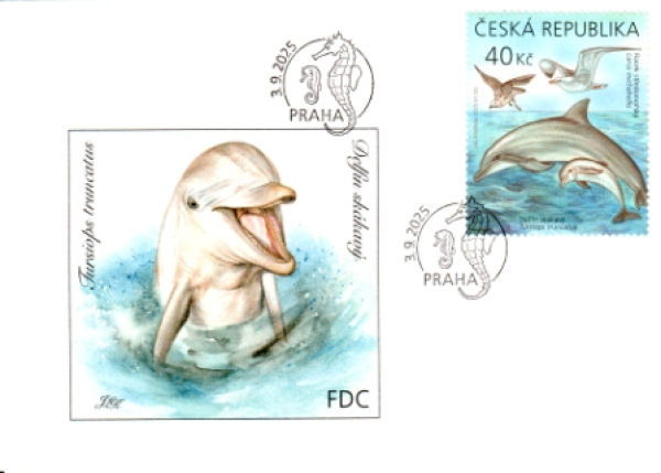 Briefmarken: a) 31 CZK ein Slawischer Fliegenschnäpper, b) 35 CZK ein Bergmurmeltier, c) 36 CZK ein Bergsteinbock, d) 40 CZK ein Tümmler und eine Mittelmeermöwe.