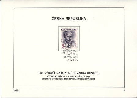 Mi.-Nr.: 038 / Geburtstag von Edward Benes Ersttagsstempel: "18. 5. 1994 / Praha" Motiv: Persönlichkeiten / Politik / Dr. Edvard Benes (1884 - 1948) / tschechische Politiker / 2. Präsident Maße ca.: 209 x 146 mm