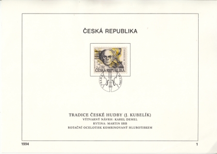 Mi.-Nr.: 030 / Tradition der tschechischen Musik Ersttagsstempel: "19. 1. 1994 / Praha" Motiv: Persönlichkeiten / Kultur / Kunst / Musik / Jan Kubelik (1880 - 1940) / tschechischer Komponist Maße ca.: 209 x 146 mm