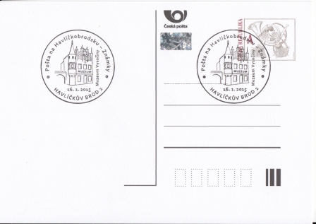 Ort der Verwendung: Postamt 580 02 Havlíčkův Brod 2 (19. 1. – 21. 1. 2015 ); Sonderpostschalter in Museum „Vysočiny“ Havlíčkův Brod – „Havlíčkův“ Haus(16. 1. 2015)