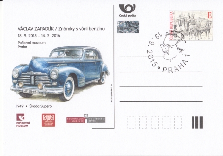 Zudruck sh. Abbildung und Text: "Václav Zapadlík - Briefmarken mit Benzinduft / 18.9. 2015 - 14. 2. 2016 / Postmuseum Praha / 1949 / Škoda Superb"