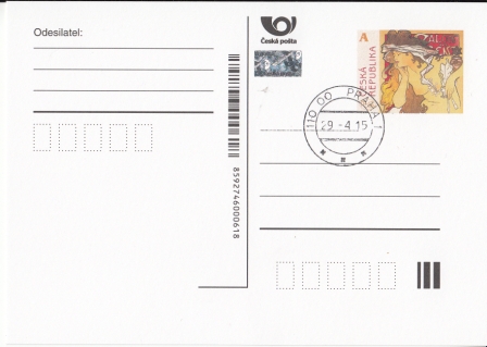 Postkarte - "A" (=10,- Kcs) / Marken mit Symbol "A" / bestimmt für Standart Briefpost bis 50 Gr im Innenverkehr / Geburtstag von Alfons Mucha