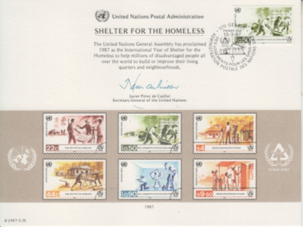 Philatelistisches Souvenir / Gedenkblatt Unterkunft für Obdachlose / frankiert mit UNO Genf Mi.-Nr.: 154