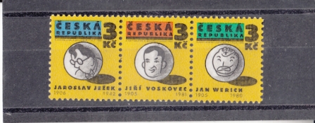 Mi.-Nr.: 69 + 67 + 68 / Gründer des Freien Theaters / J. Jezek (1906 - 1942) + J. Voskovec (1905 - 1981) + J. Werich (1905 - 1980) Marke + Marke + Marke / Zusammenhängend - Dreierstreifen