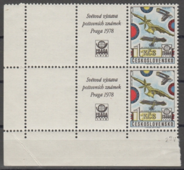 Mi.-Nr.: 2396 / Internationale Briefmarken Ausstellung PRAGA 1978 - Geschichte des Flugwesens / Zeppelin - Luftschiffe LZ - 1 (1909) + LZ - 127 (1928) Achtg! Einzelmarke aus Satz / 1. Reihe: LF + ZF + Marke + 2. Reihe: LF + ZF + Marke / Knick links unten sh. Abbildung (außerhalb der Marke)