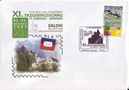 SOST: "Schwarzenberg / 02. - 04. Oktober 2009 / XI. Erzgebirgsschau / IV. EUREGIO - EGRENSIS / Verein für Sächsische Postgeschichte und Philatelie e. V. / PostModem / 08340 / Dresden"