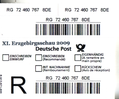 Philatelistisches Souvenir / "R" - Aufkleber der Deutschen Bundespost / mit Zusatzstempel (schwarz): "XI. Erzgebirgsschau 2009" sh. Abbildung nicht gelaufen Maße ca: 74 x 64 mm