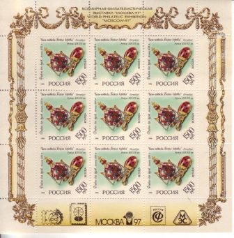 Mi.-Nr.: 536 + 539 / Emailkunst aus dem Eremitage - Museum in Sankt Petersburg Bemerkung: Die Mi.-Nr.: 539 wurde gedruckt in Kleinbögen mit Bogenrandzudruck für die Internationale Briefmarkenausstellung MOSKAU `97