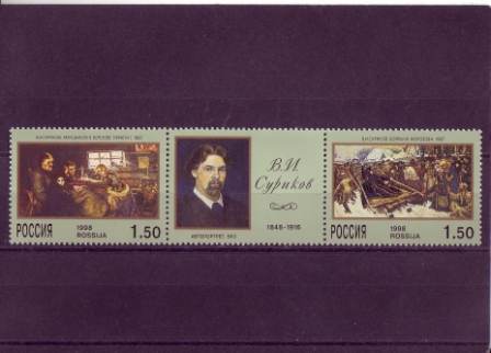 Mi.-Nr.: 639 + ZF + 640 / 150. Geburtstag von Wassilij Surikow Dreierstreifen / Marke + Zierfeld + Marke