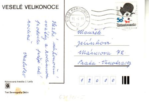 rückseitig Tagesstempel: „530 02 Pardubice / 11. 4. 90“ + Wellenstempel