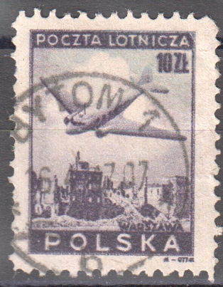 Freimarken: Flugzeug über Warschau gestempelt sh. Abbildung / Achtg! Einzelmarke aus Satz / Zähnung katastrophal Motiv: Beförderungsmittel / Transport / Verkehr / Flugzeug / Transportflugzeug Lissunow LI 2 über den Trümmern von Warschau