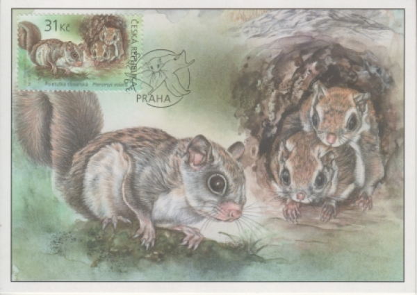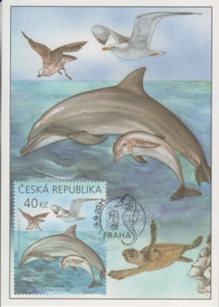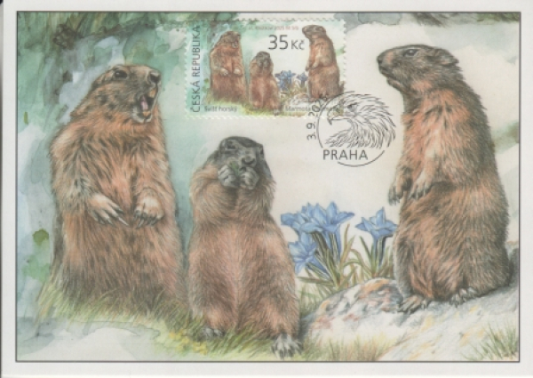 Maximum- bzw. Analogkarten - Europäische Tiere mit ihren Jungen - Evropská zvířata s jejich mláďaty / Slawischer Fliegenschnäpper - poletuška slovanská ● Bergmurmeltier - svišť horský ● Bergsteinböck - kozorožec horský ● Großer Tümmler und Mittelmeermöwe - delfín skákavý a racek středomořský