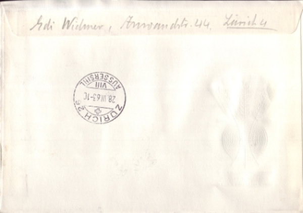 rückseitig Ankunftsstempel: "Zürich 26 / 28. III. 63"