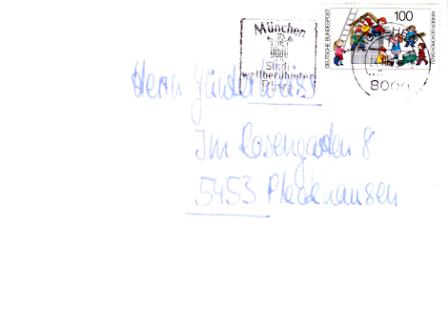 Brief nach Pleckhausen / frankiert mit Bundesrepublik Deutschland Mi.-Nr.: 1435 Tagesstempel: "München / 24. 10. 89 / 8000" + Werbestepel sh. Abbildung echt gelaufen - übliche Qualität Maße ca: 162 x 115 mm