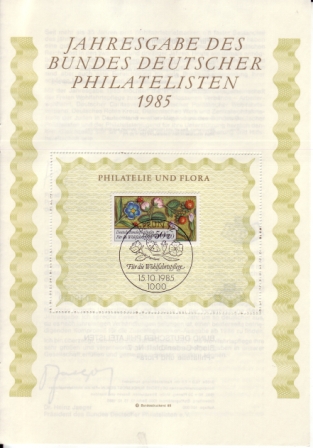 Philatelistisches Souvenir / Jahresgaben des Bundes Deutscher Philatelisten e. V. - 1985 Faltblatt - mit Berlin West Mi.-Nr.: 744 - nicht frankaturgültig Auflage 100.000 Stück mit Perforierung und Nummerierung Maße ca: 148 x 210 mm bzw. 296 x 210 mm