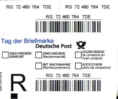 Philatelistisches Souvenir / „R" - Aufkleber der Deutschen Bundespost / mit Zusatzstempel (blau): "Tag der Briefmarke" sh. Abbildung nicht gelaufen Maße ca: 74 x 64 mm