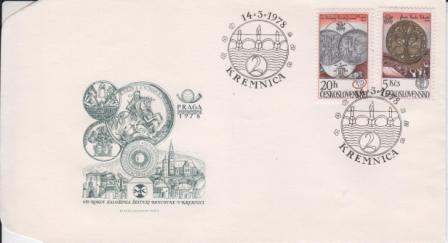 Mi.-Nr.: FDC 2427 - 2431 / Internationale Briefmarken Ausstellung PRAGA 1978 - 650 Jahre Kremnitzer Münze / Silbergedenkmünzen (1964 und 1965) ■ Medaille "Wiesenblume" (1972) ■ Gedenkmedaille "Karlsuniversität" (1948) ■ Krönungsmedaille "Ferdinand I" (1563) ■ Goldgulden "Karl Robert" (1335)