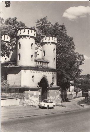 Wlaschim / Středočeský kraj / okres: Benešov / obec s rozšířenou působností: Vlašim / pověřená obec Vlašim / brána "Vlašimská" (ze silnice) - bez postav / Hochformat / černobílá / bez popisu na přední straně / popis na zadní straně "Vlašim - Zámecká brána - Foto Inž. M. Nixbauer - Kčs 0,20 ve prospěch cestovního ruchu - Nakladatelství PRESSFOTO Praha" / Schloss Hauptpforte "Vlašimska"