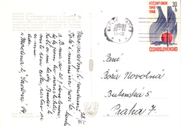 rückseitig Tagesstempel: „Karlovy Vary 2 / 29. VI. 1968“ + Wellenstempel
