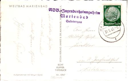 rückseitig Tagesstempel: "Mar??? / 31. 5. 41" - Rest unleserlich + zusätzliche Stempel: "Jugenderholungsheim Marienbad Sudetengau" sh. Abbildung