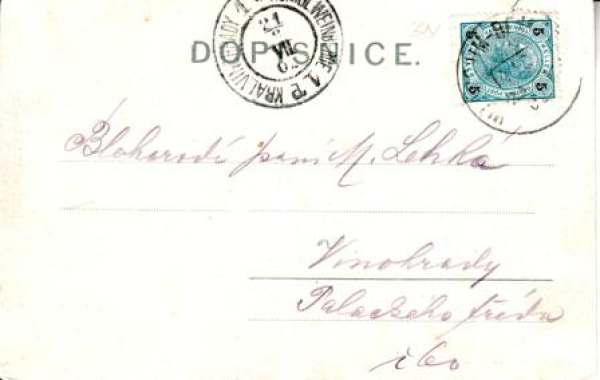 rückseitig Tagesstempel: unleserlich Ankunftsstempel: „Král. Vinohrady 1 / 21. VII. 02“ Datum mit vorbehalt