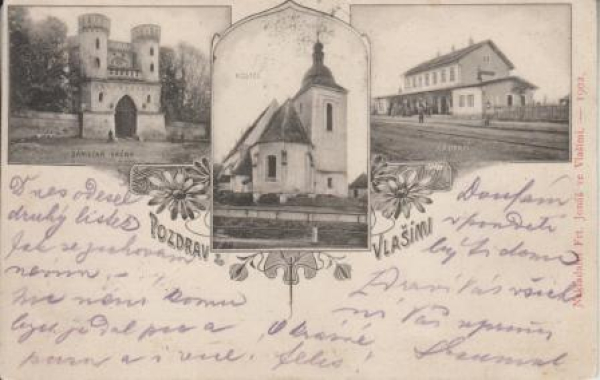 Wlaschim / Středočeský kraj / okres: Benešov / obec s rozšířenou působností: Vlašim / pověřená obec Vlašim / více náhledů / 03 obrázků (kostel sv. Jiljí - nádraží - Vlašimská brána) / Querformat / černobílá / popis na přední straně "Pozdrav z Vlašimi - Zámecká brána - Kostel - Nadraží - Nakladatel Frt. Jonáš ve Vlašimi. - 1902" / popis na zadní straně "Dopisnice" / mehrere Ansichten