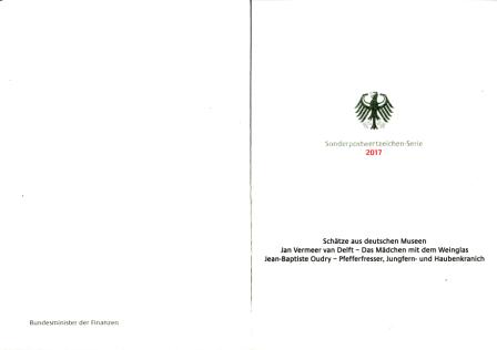Philatelistisches Souvenir / Minister Faltkarte / mit Unterschrift (unleserlich) / Schätze aus deutschen Museen - Das Mädchen mit dem Weinglas und Pfefferfresser, Jungfern- und Haubenkranich Mi.-Nr.: 3274 - 3275