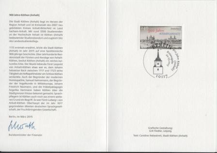 Ersttagsstempel / SOST: „Berlin / 900 Jahre Köthen (Anhalt) / Erstausgabetag / 02. 03. 2015 / 10117“