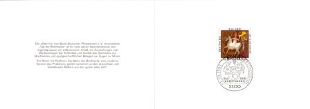 Philatelistisches Souvenir / Minister Faltkarte / Postreiter Mi.-Nr.: 1192 Ersttagsstempel / SOST: „Bonn 1 / 13. 10. 1983 / Erstausgabe / Tag der Briefmarke / 5300“ Auflage ??.??? Stück Maße ca: 148 x 105 mm bzw. 296 x 105 mm
