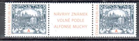 Grußmarke - 100 Jahre Hradschin - Freimarken von Alfons Mucha / A. Mucha: Hradčany "A" Mi.-Nr.: 0961 / Marke + ZF (B) + Marke / ZF (B) = Text: "Freie Briefmarken Entwürfe nach Alfons Mucha" / waagerecht