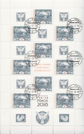 Kleinbogen = 9 Briefmarken + 12 Zierfeldern (6 verschiedene - 7x ZF (A) = sh. Mi.-Nr.: 17 + 1x ZF (B) = Text: "Freie Briefmarken Entwürfe nach Alfons Mucha" + 1x ZF (C) = Text: "World Stamp Exhibition - PRAGA 2018" + 1x ZF (D) = vergrößerte fliegender Falke + 1x ZF (E) = stilisierte Taube - nach rechts + 1x ZF (F) = stilisierte Taube - nach links