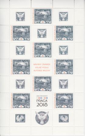 Kleinbogen = 9 Briefmarken + 12 Zierfeldern (6 verschiedene - 7x ZF (A) = sh. Mi.-Nr.: 17 + 1x ZF (B) = Text: "Freie Briefmarken Entwürfe nach Alfons Mucha" + 1x ZF (C) = Text: "World Stamp Exhibition - PRAGA 2018" + 1x ZF (D) = vergrößerte fliegender Falke + 1x ZF (E) = stilisierte Taube - nach rechts + 1x ZF (F) = stilisierte Taube - nach links