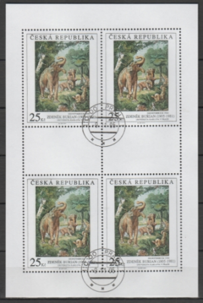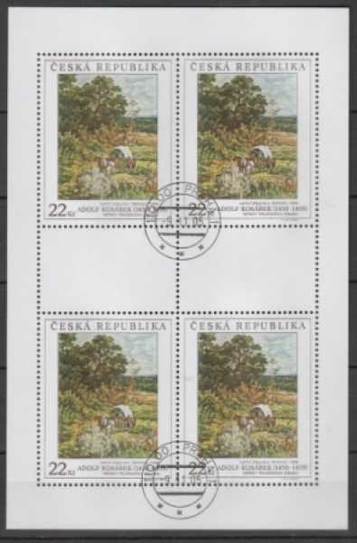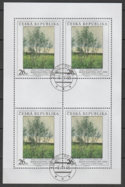 Mi.-Nr.: KLBG 451 - 453 / Gemälde aus nationalen Galerien / Landschaft im Sommer von Alfons Kosárek (1830 - 1859) ● Deinotherium von Zdeněk Burian (1905 - 1981) ● Zitterpappeln bei Velké Němčice von Alois Kalvoda (1875 - 1934) Ersttagsstempel / Kleinbogen = 4 Briefmarken