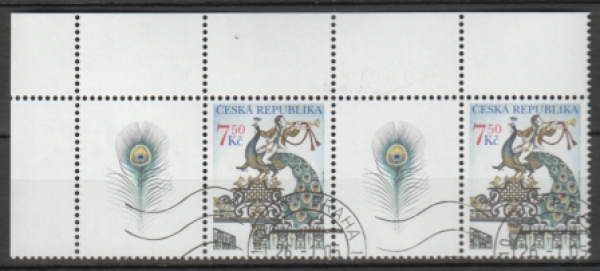 Mi.-Nr.: 423 / Freimarke - Tor mit Pfau Tages- Rundstempel + Wellenstempel / Zierfeld links + Marke + Zierfeld rechts + Marke