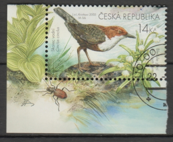 Mi.-Nr.: 439 / Geschützte Tiere und Pflanzen / 14,- Kč Wasseramsel + Märzenbecher Tages- Rundstempel / Einzelmarke aus Block Mi.Nr.: BL 23